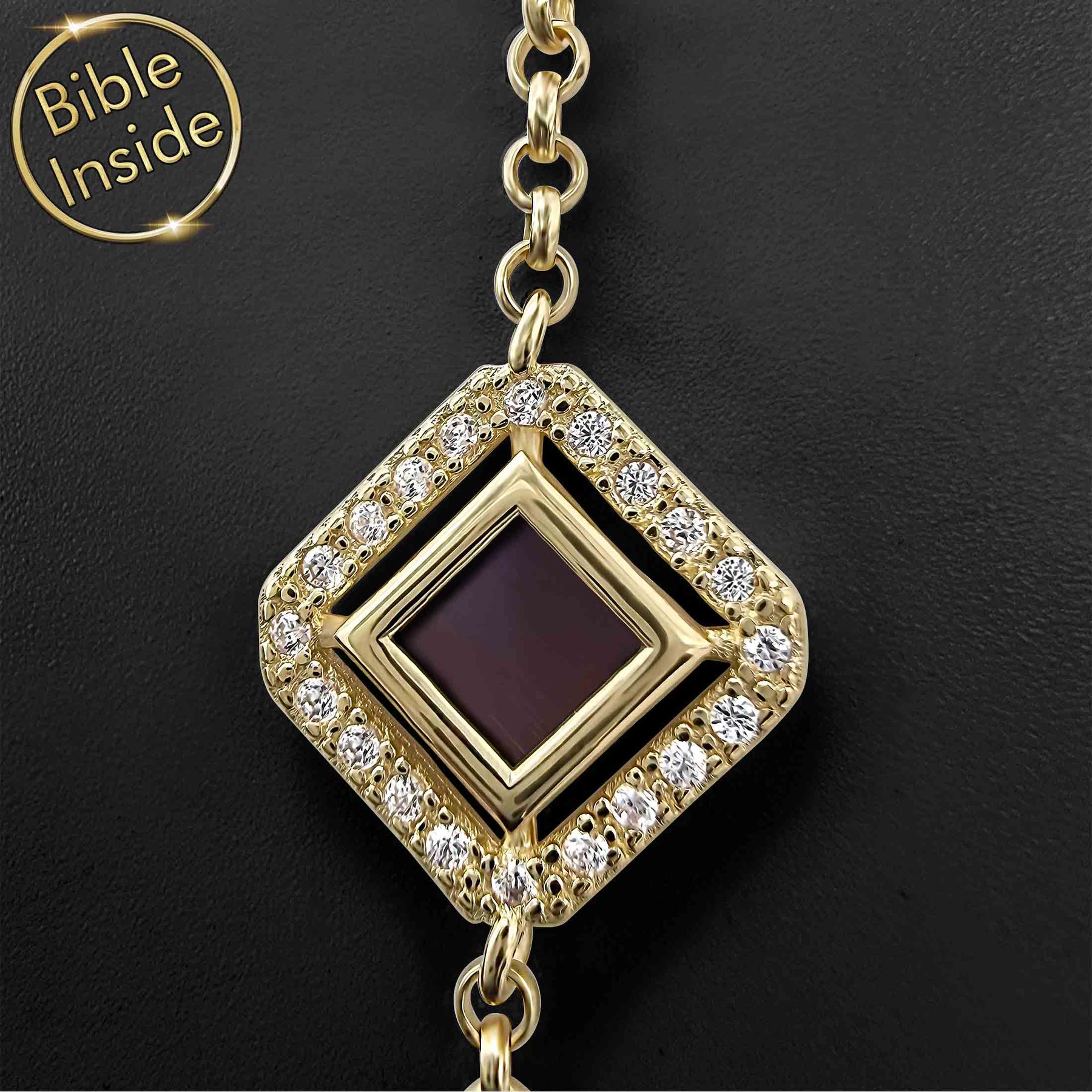 This Christian meaningful jewelry piece for women showcases a beautifully crafted rhombus pendant housing an extraordinary microchip Bible. The complete New Testament is engraved on a tiny 0.2"/0.5cm square chip visible only under 1000x magnification.