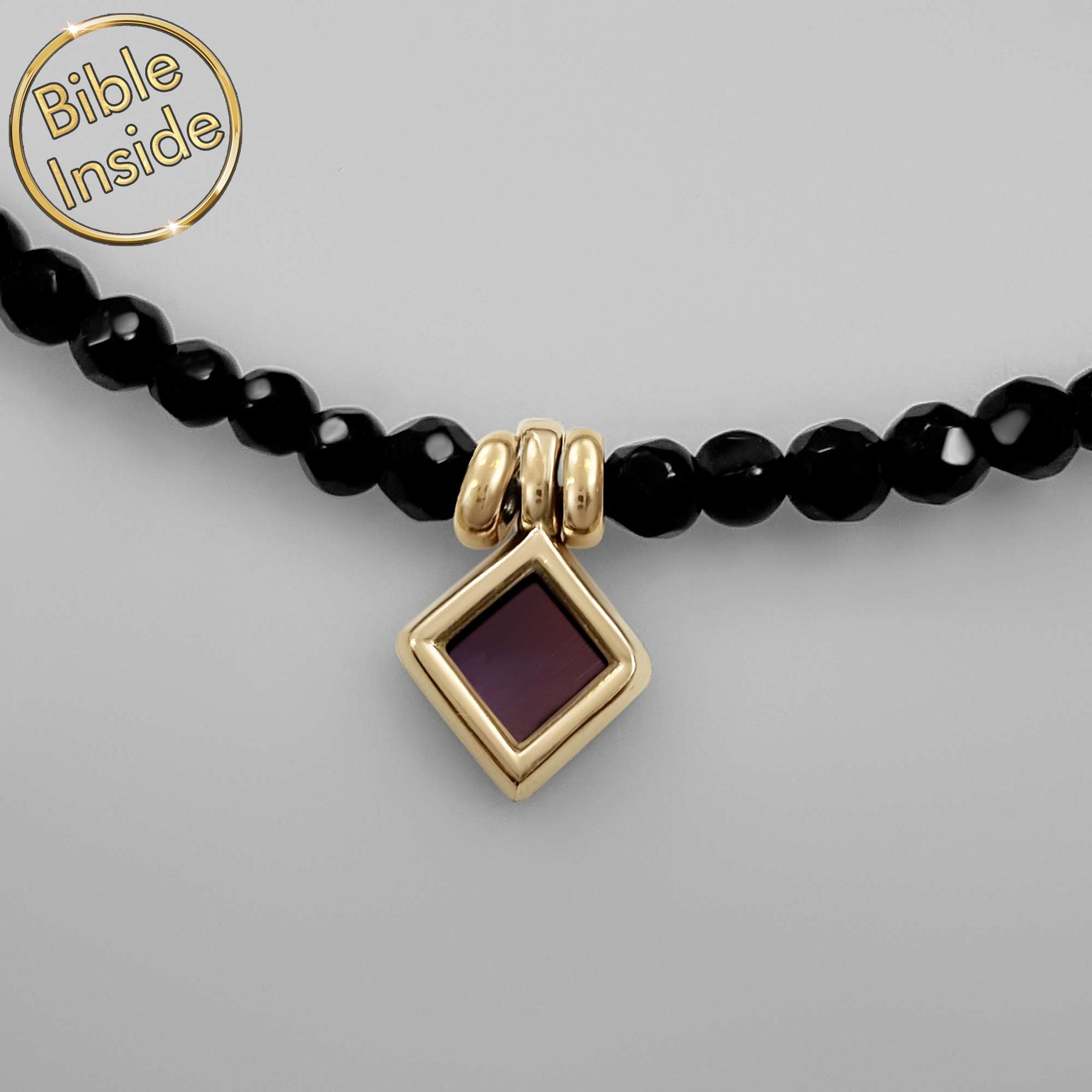 Womens Christian jewelry meets innovation with the Terra Onyx Necklace, featuring a miniature Bible chip invisibly engraved within a sleek rhombus pendant. This minimalist design combines timeless elegance with meaningful scripture, creating a daily reminder of faith.