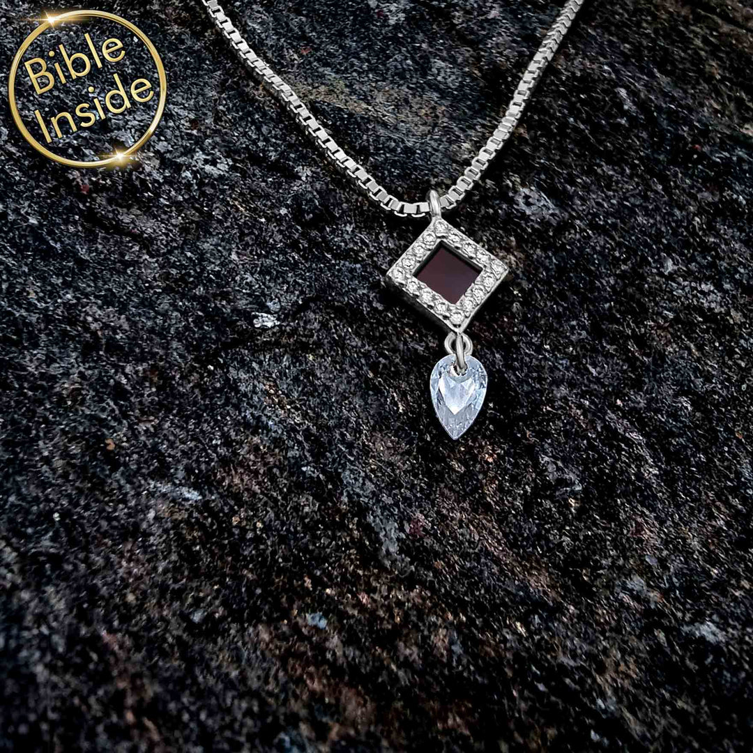 Christians gift necklace displaying square microscopic Bible pendant