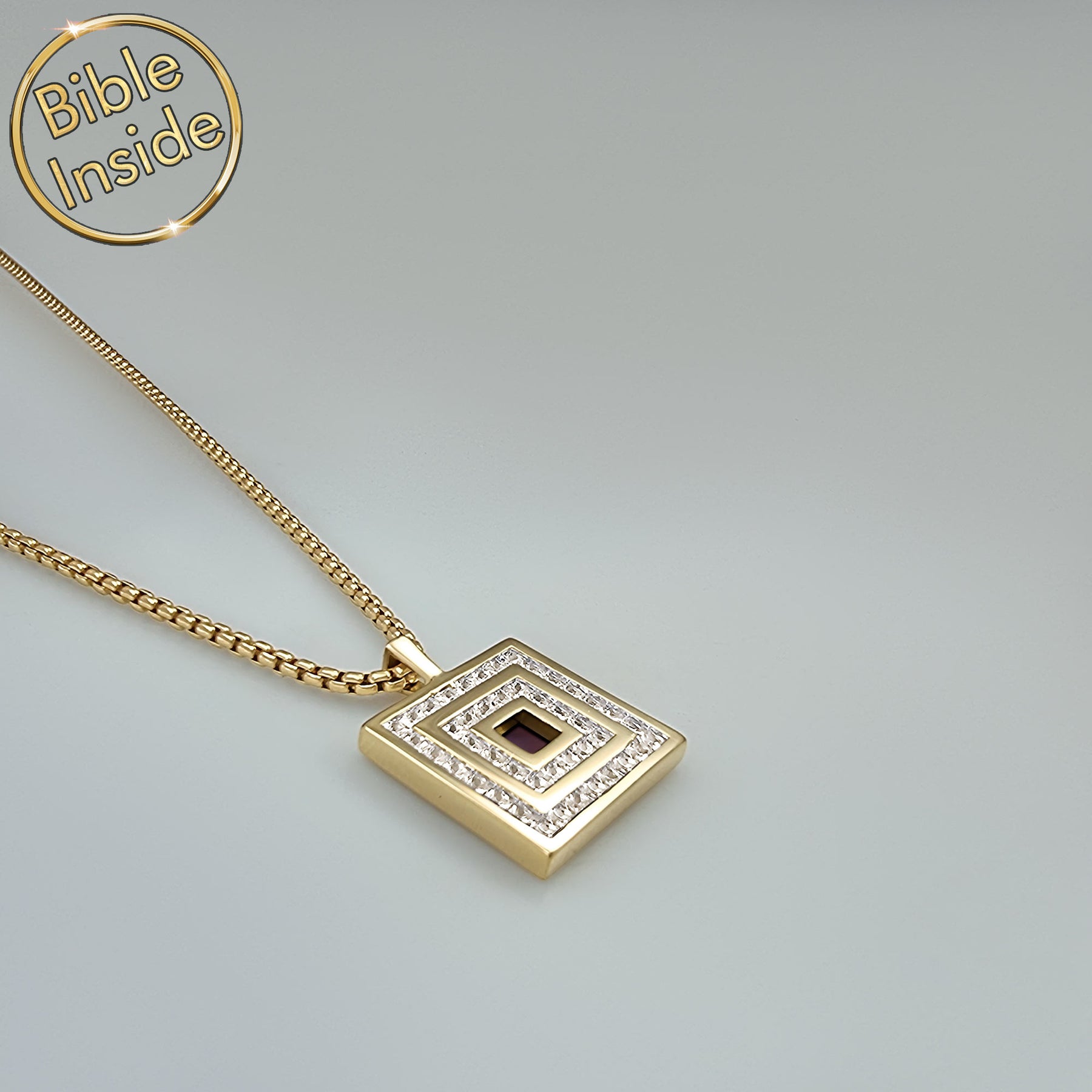 Christian jewelry has evolved beyond traditional symbols, with necklaces offering fresh expressions of faith. The Romeo redefines devotion through innovative design. This square pendant contains either the New Testament or Old Testament on a nano Bible chip measuring 0.2"/0.5cm. Every word of scripture exists within this miniature marvel, visible only under a 1000x metallurgical microscope.