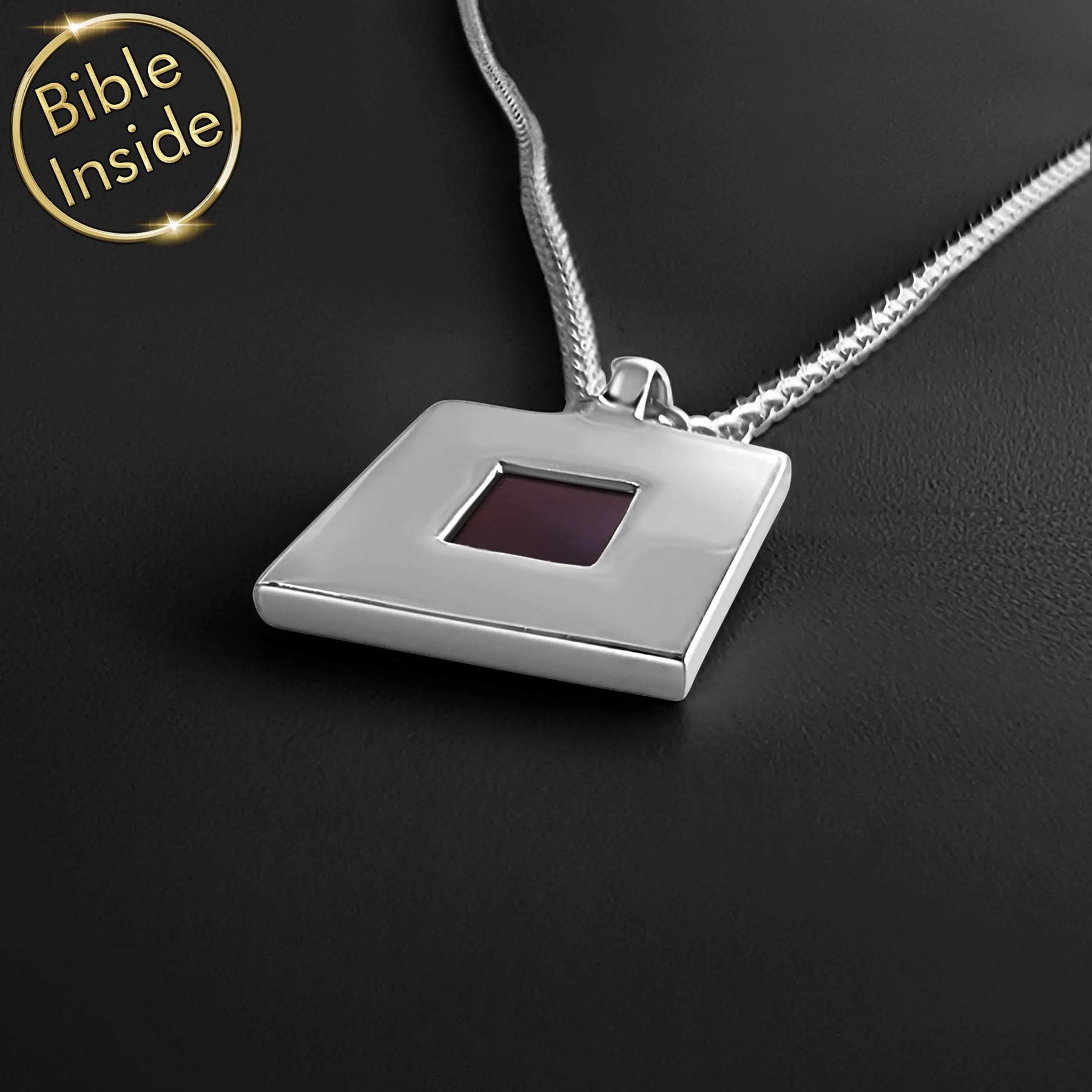 Our Valentine meaningful pendant carries the New Testament on a microchip Bible measuring 0.2"/0.5cm. This cubo design represents stability and foundational Christian truths. The square symbolizes the four Gospels.